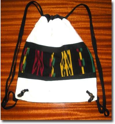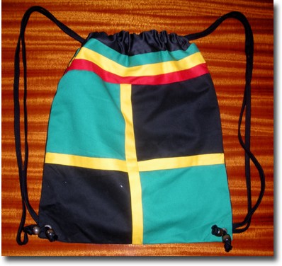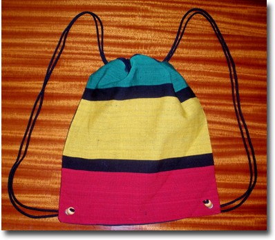 Catalog # 1007 - Rasta bag can be used as backpack or shoulder bag. Comes in assorted designs, all in Rasta colors. 100% cotton. 14" x 17"