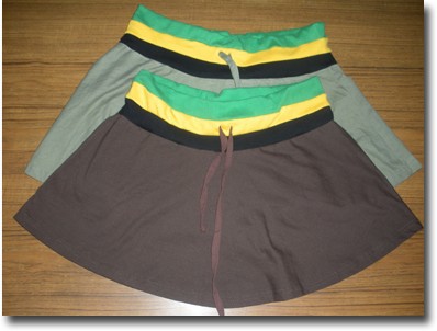 Catalog # 1100 - Jamaican skirt with solid background and waist band in Jamaican colors. Comes in olive and chocolate. 100% cotton. Sizes M, L ,XL