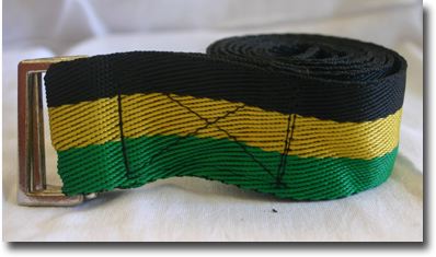 Catalog # 1022 - Nylon belt with Jamaican colors of black, yellow, green. 1 1/2" x 50"