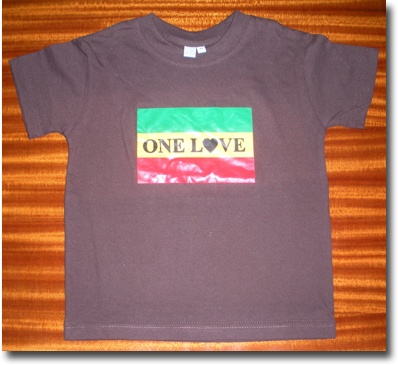 Catalog # 1029 - The phrase "one love" made famous by Bob Marley, on emblem in Rasta colors. Tee shirt comes in black, olive, chocolate and khaki. Sizes XS - XL. 100% cotton.