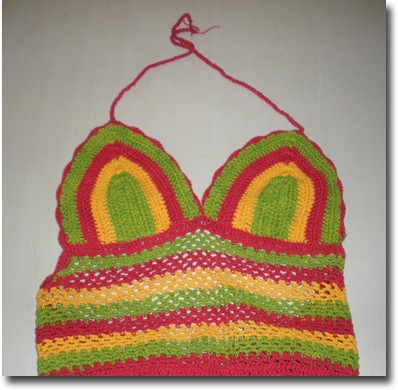 Catalog # 1104 - Crochet top in Reggae colors. Red, yellow, green hand crocheted, 100% cotton. One size fits most.