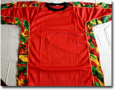 Catalog # 1044 - Mesh tee shirts in rasta colors of red, yellow, green stripes or reggae camouflage. Designs are mixed. Sizes M - XXL. 100% nylon.